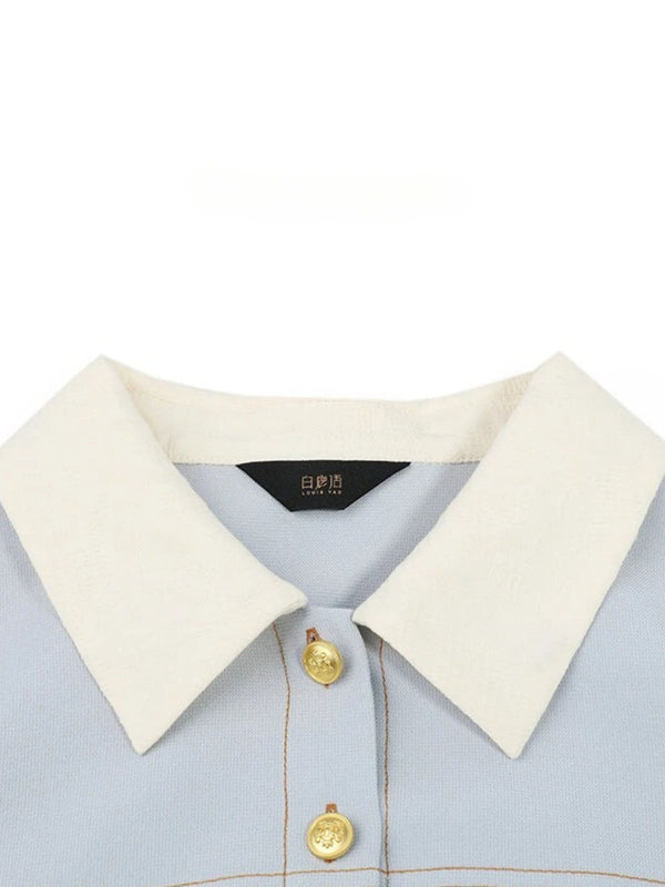 - Features: A-line silhouette, Turn-down collar, Front button closure, Short sleeves