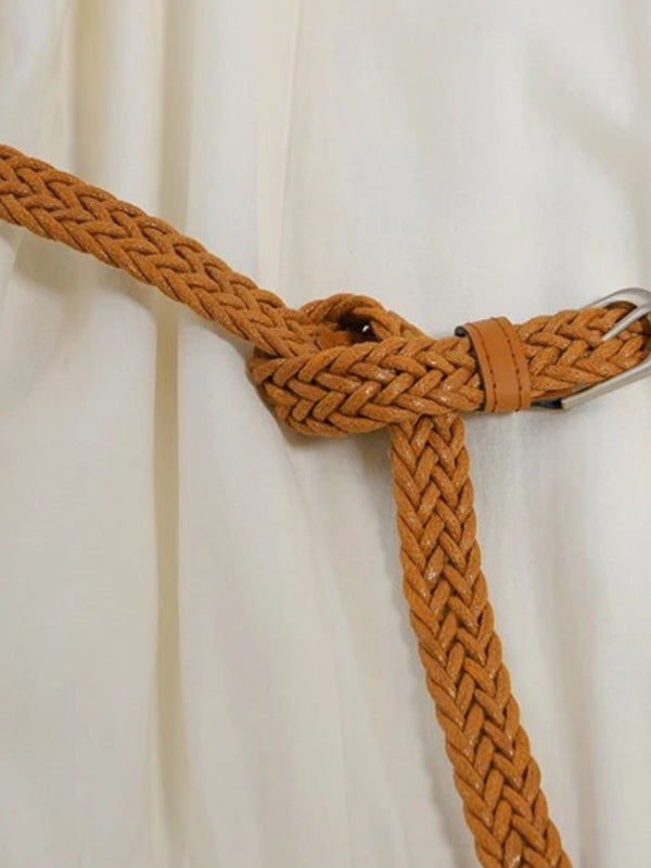 - Features: Braided belt, V-neckline, Smocked waist, Layered hem, A-line silhouette