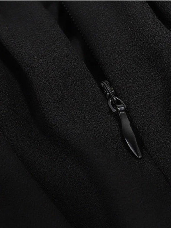 - Features: Sheer sleeves, Stand collar, Draped details, A-line silhouette