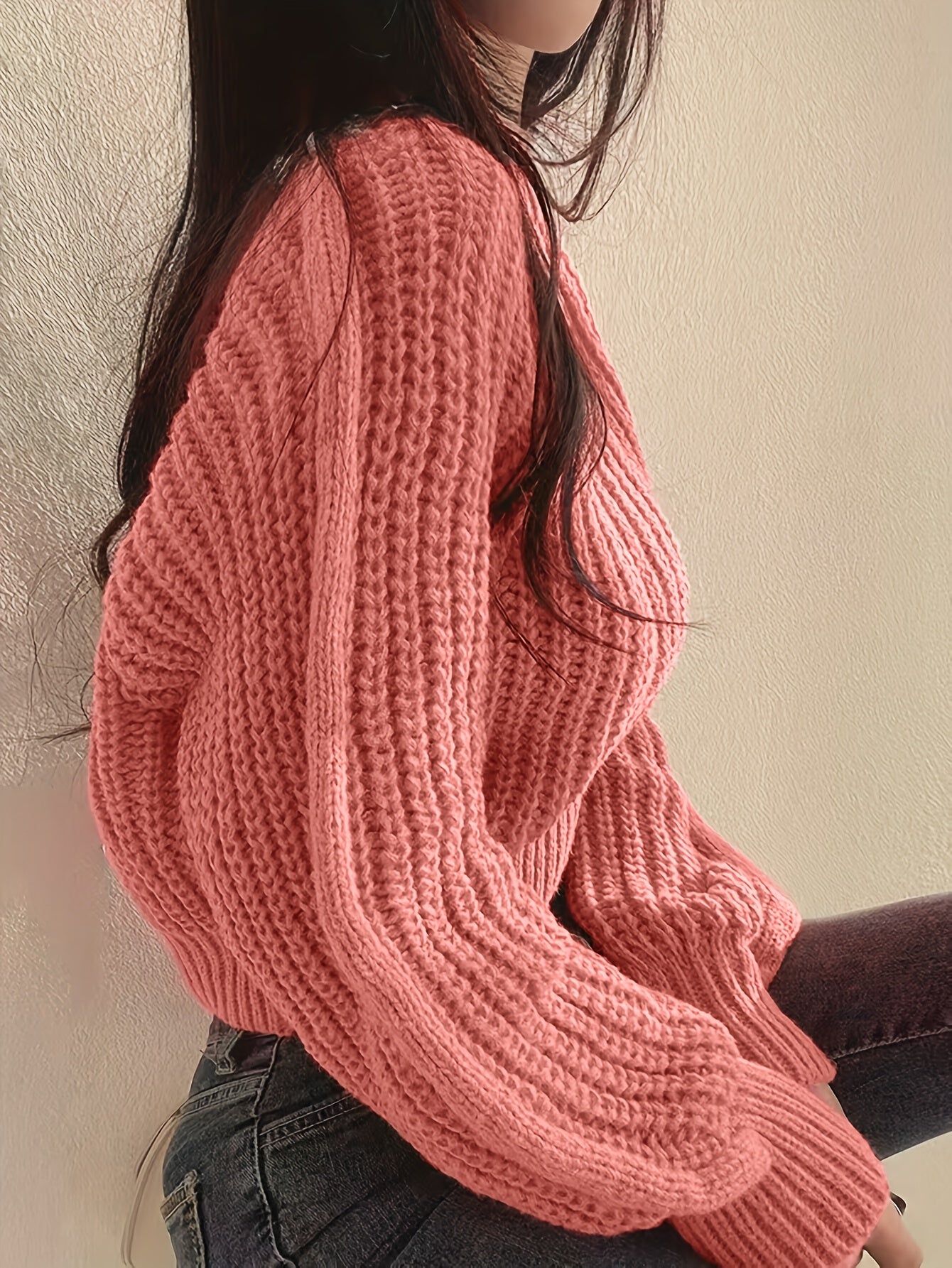 This sweater hits at the waist for a flattering cropped silhouette. The chunky rib knit adds rich texture and visual depth. Long, relaxed sleeves enhance the cozy, casual vibe. A simple yet powerful staple with contemporary character.