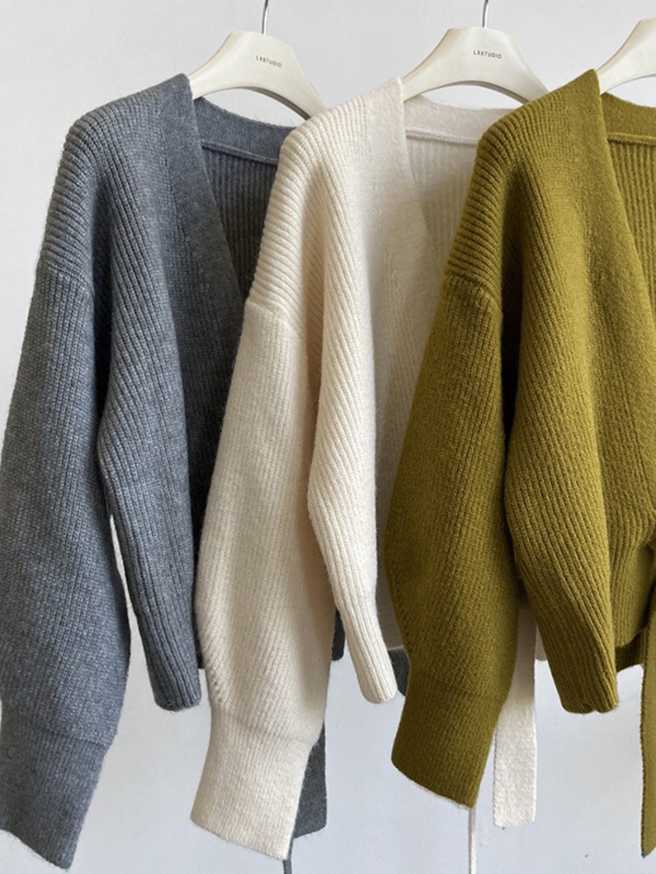 This sweater wraps gently around the body with a refined, feminine fit. The wrap design highlights the waist with graceful structure. Dropped shoulders and long sleeves add ease and balance. A quietly luxurious piece that pairs minimalism with softness.